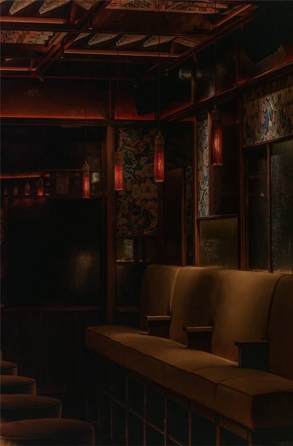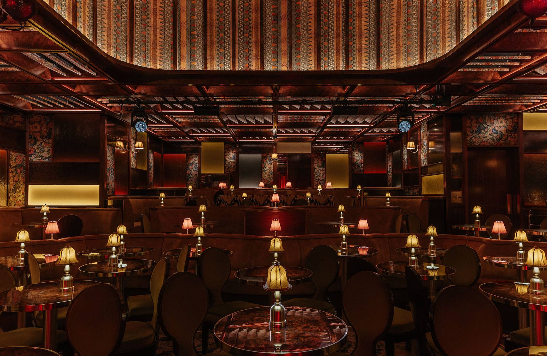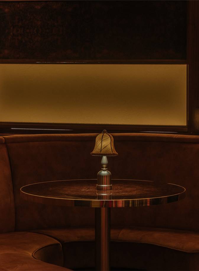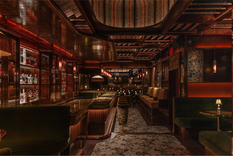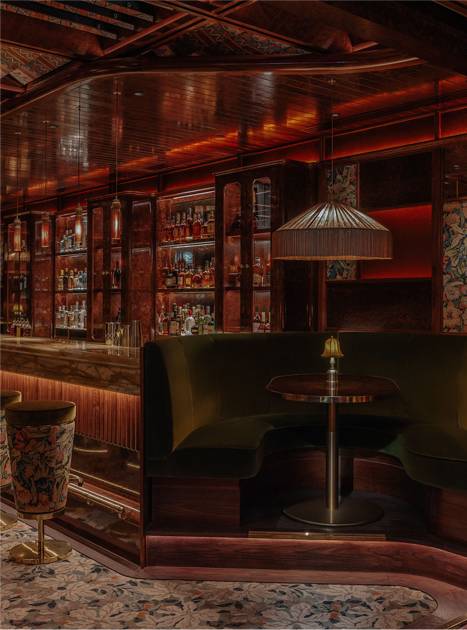 The design ethos for Upstairs at Ronnie’s balances glamour and intimacy, blending classic jazz-club sensibilities with contemporary luxury. Anchored by plush golden-velvet banquettes, elegant tassel lamps, and antique mirrors that catch the glow of soft lighting, the space feels both timeless and inviting. A standout feature is the dramatic domed ceiling, lined with striking Zimbabwean fabric, adding texture, pattern, and a rich sense of global craft to the interior. Overhead panels allow natural light to filter in by day, while at night the venue becomes moodier and performance-focused. A purpose-built auditorium with tiered seating and acoustics tailored for live music ensures every guest enjoys exceptional sightlines and sound, centred around a stage equipped with a Yamaha grand piano and state-of-the-art lighting.