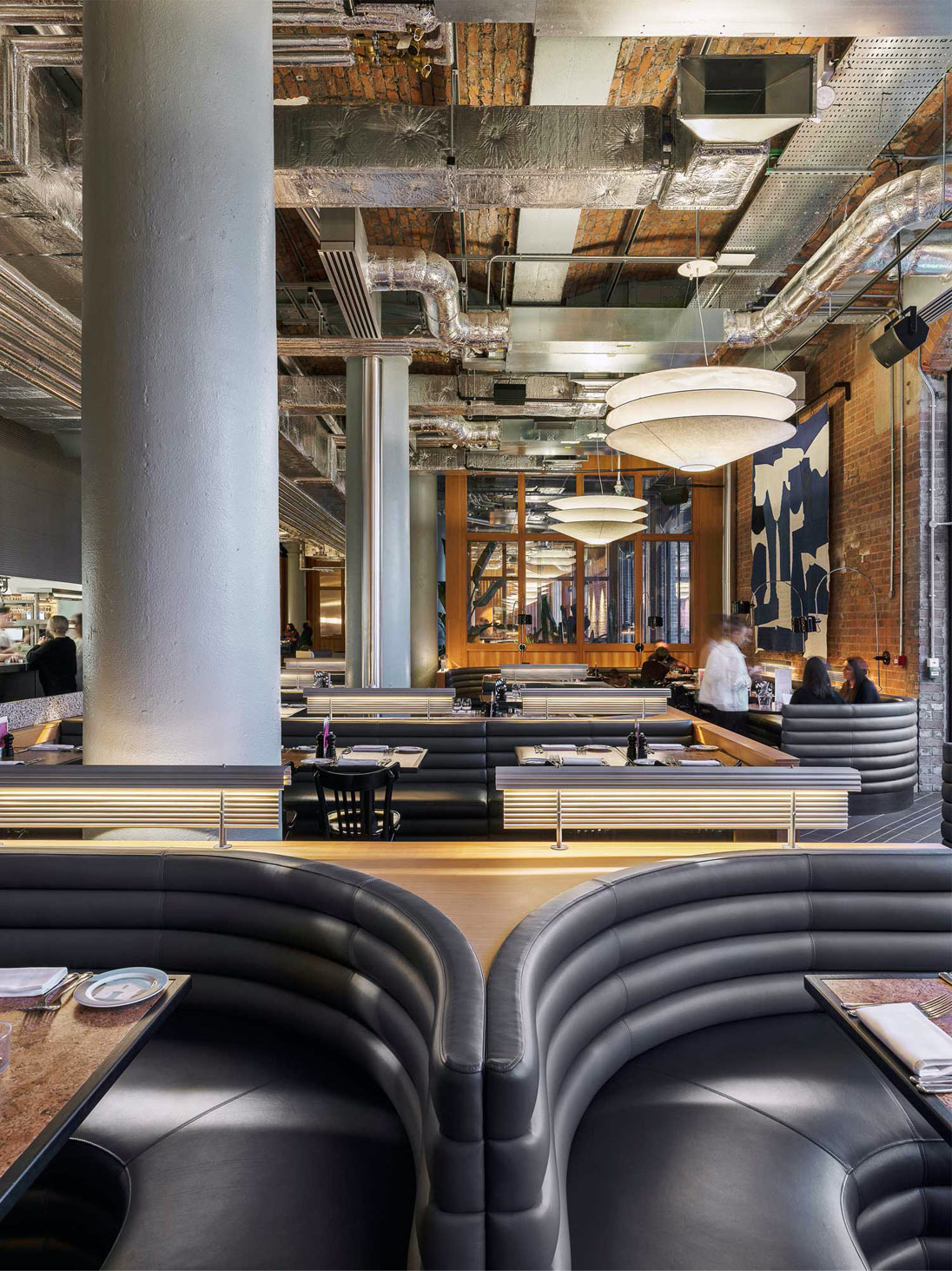 Already a triumph in Manchester, the architecture and interior design was intent on revealing the grandeur of the Victorian cotton warehouse embedded in the heritage of the rail and canal network, whilst layering the interior to reveal the cavernous space in isolated pockets. With a rich history, both nuanced and audacious it was important to find a human scale in the narrative with comfort. This was achieved in an architectural language that is reminiscent of a public library where you can have solace in the open plan whilst being part of the community ‘living room’- a ground floor social hub Includes an 80-seater restaurant, a Mini-Cini, coffee counter and flexible events and workspaces, providing a unique community centre and all-day hangout.