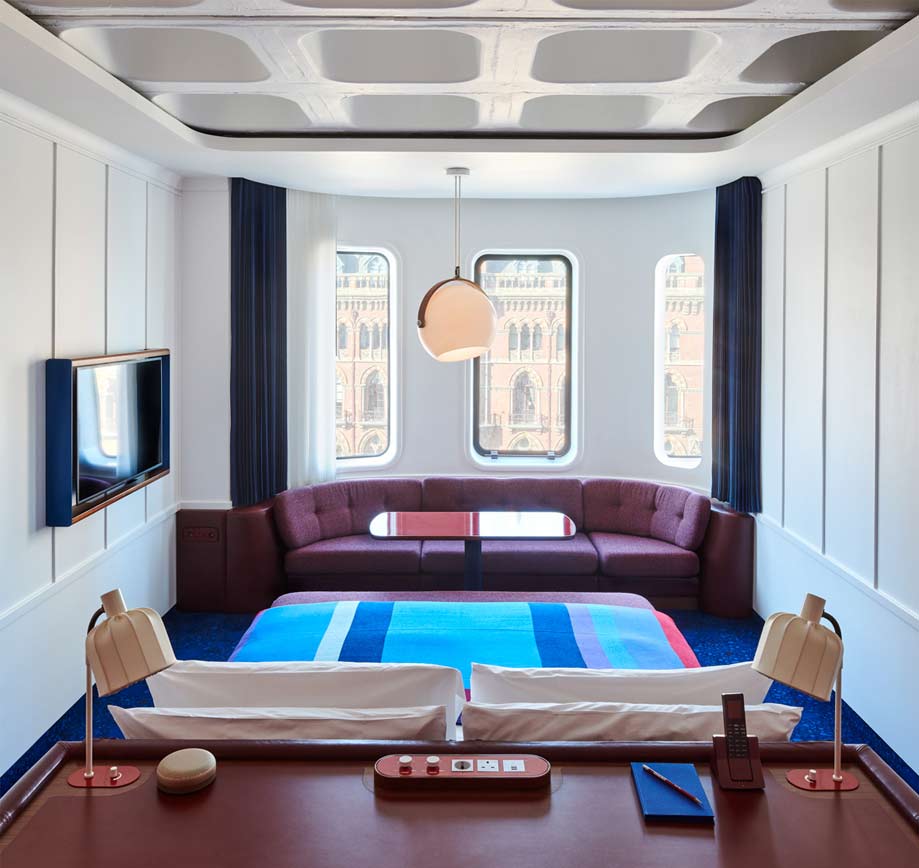 With 266 rooms (42 different styles), and sat just across from St Pancras station in King’s Cross, the eating and the drinking scene has reshaped the building into a formidable destination which Vanity Fair describes the brand as “Confident, Worldly and a little Mysterious.” Paying homage to one of the building's original uses as a public library is the library lounge, with a proper library of books in 26 different genres, carefully chosen and maintained by a local librarian, with restaurants Double Standard and Decimio a rooftop destination reached by a red bullet elevator. Architectural Brutalism has shifted from carbuncle to ‘regain their cool this century’ where Archer Humphryes previously revivified Georgian, Victorian and Edwardian building in recent years this has shifted to iconic deco and post war concrete structures including the Queen Elizabeth Hall on the Southbank, The Philips Haus in Vienna and the Gstaad Palace. In all projects, including the Standard the aim was to bring vibrancy, colour and vitality into the interior starting with the Modernist Movement with the Bauhaus at its’ core all the way through the post – war years. At one point in the process the studio was working on all three hotels at that intersection of Kings Cross: The Great Northern Hotel: St. Pancras Renaissance and The Standard – all seemingly incurious how The Standard Brands’ arrival would shape the neighbourhood. That was a moment.