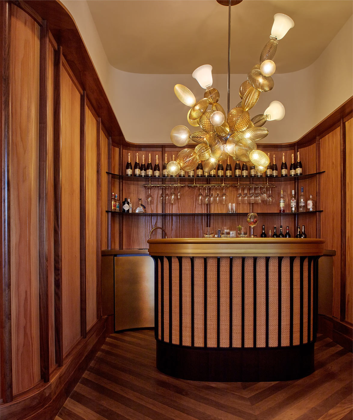 The result is a compelling restaurant drawing inspiration from the gardens with chairs finished in lilac, orange & moss green leathers. Light fittings are woven in cane & the walls are finished in sand blasted timber. The breakfast servery is hidden behind vivid folding doors & invisible at evening service. The pendant lights provide intimate & convivial ambience in the evening in contrast to the light filled airy space enjoyable at breakfast. Working with our product and furniture designs - Fratelli Boffi created the furniture, Barovier + Tossier for lighting, Sunbrella for the outdoor fabrics and occasional loose furniture from Gervasoni combined to create the striking interior.