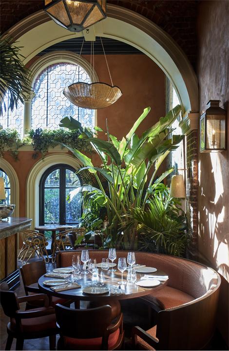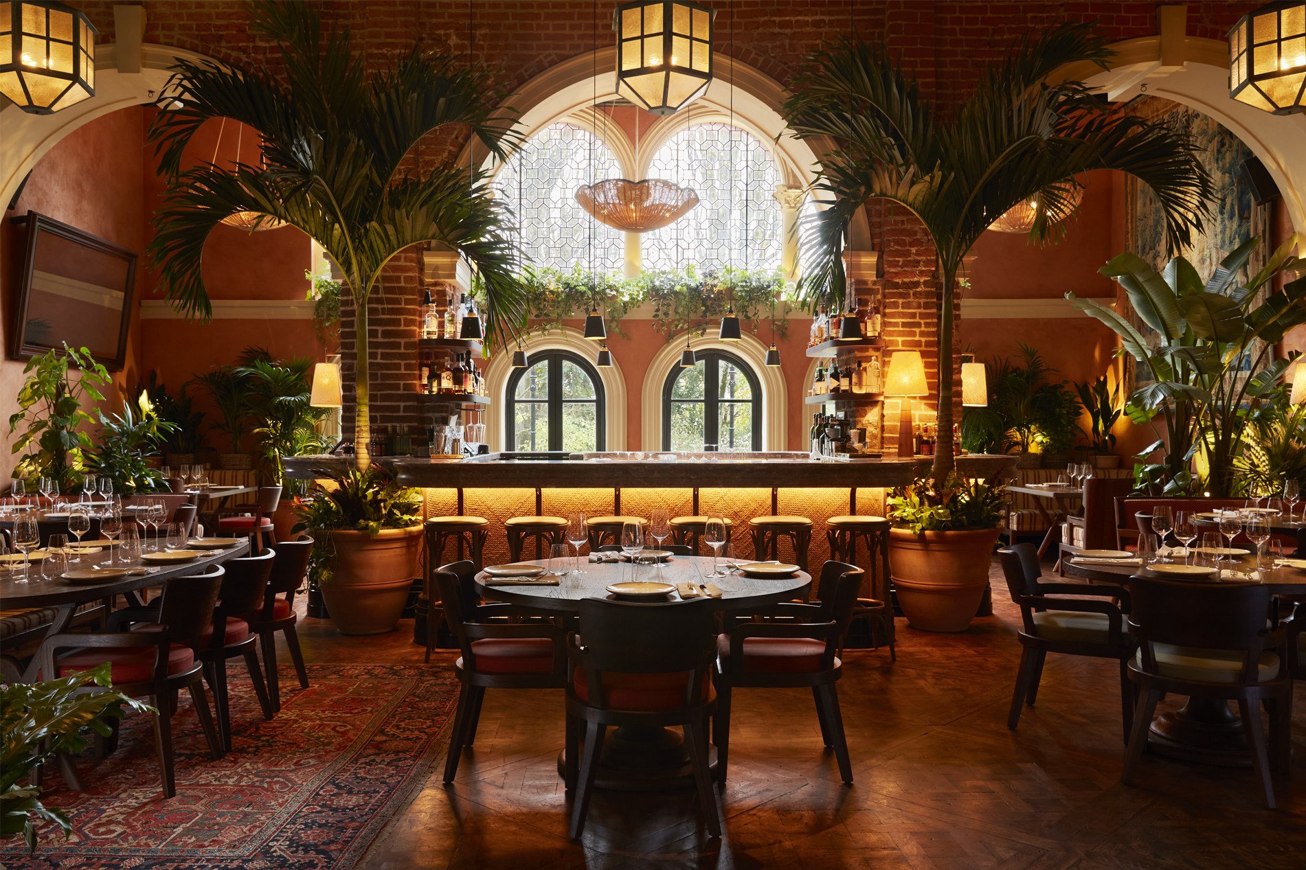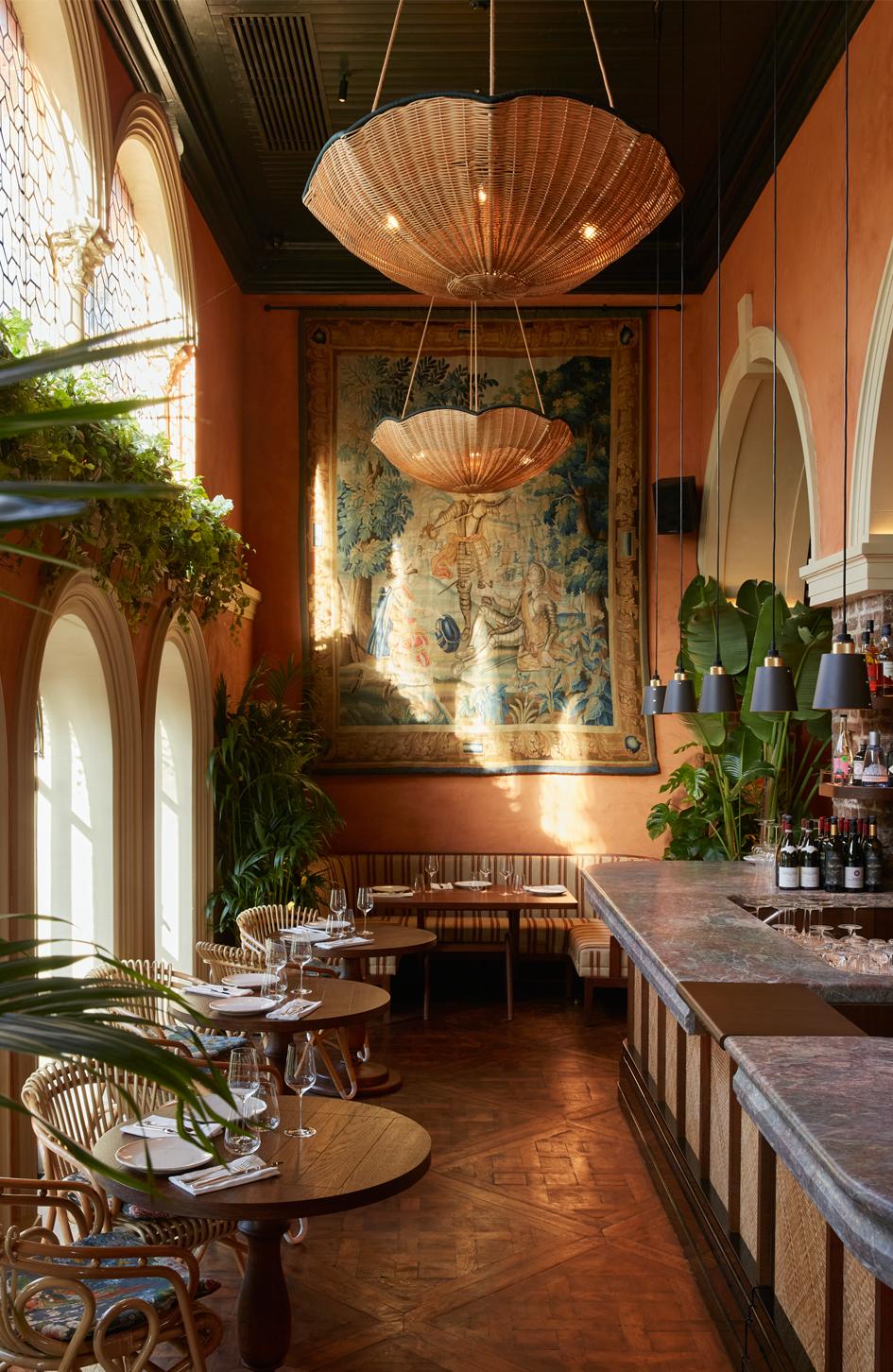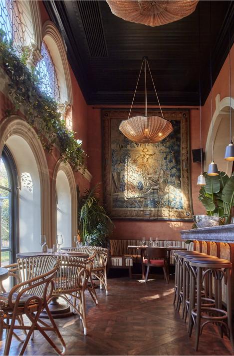 The project included the removal of existing fittings and finishes from Belvedere’s previous incarnations, in order to reveal the beauty, and brickwork, of the original building. The ground floor accommodates 60 diners, with an open theatre kitchen, a colonnade that opens out onto Holland Park and views across the park; this striking space is filled with palms and fig trees, alongside bespoke furniture designed by the Archer Humphryes’ team and manufactured by Fratelli Boffi. The upstairs salon is arranged around a central fireplace with wall-hugging banquettes and fabric-lined ceilings; the cocktail bar is upholstered in a Duncan Grant Charleston cloud print and the terrace overlooks formal gardens and a fountain. A separate private dining room is set behind within the arched openings overlooking the stables providing a dramatic and convivial space for groups and families of up to 20.