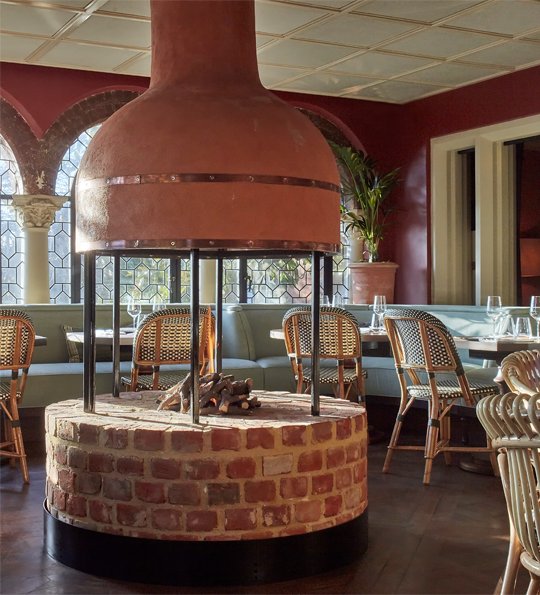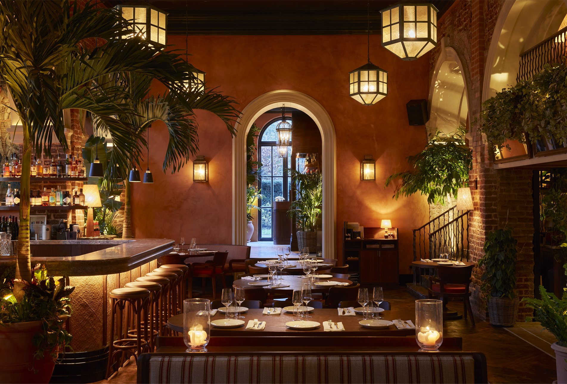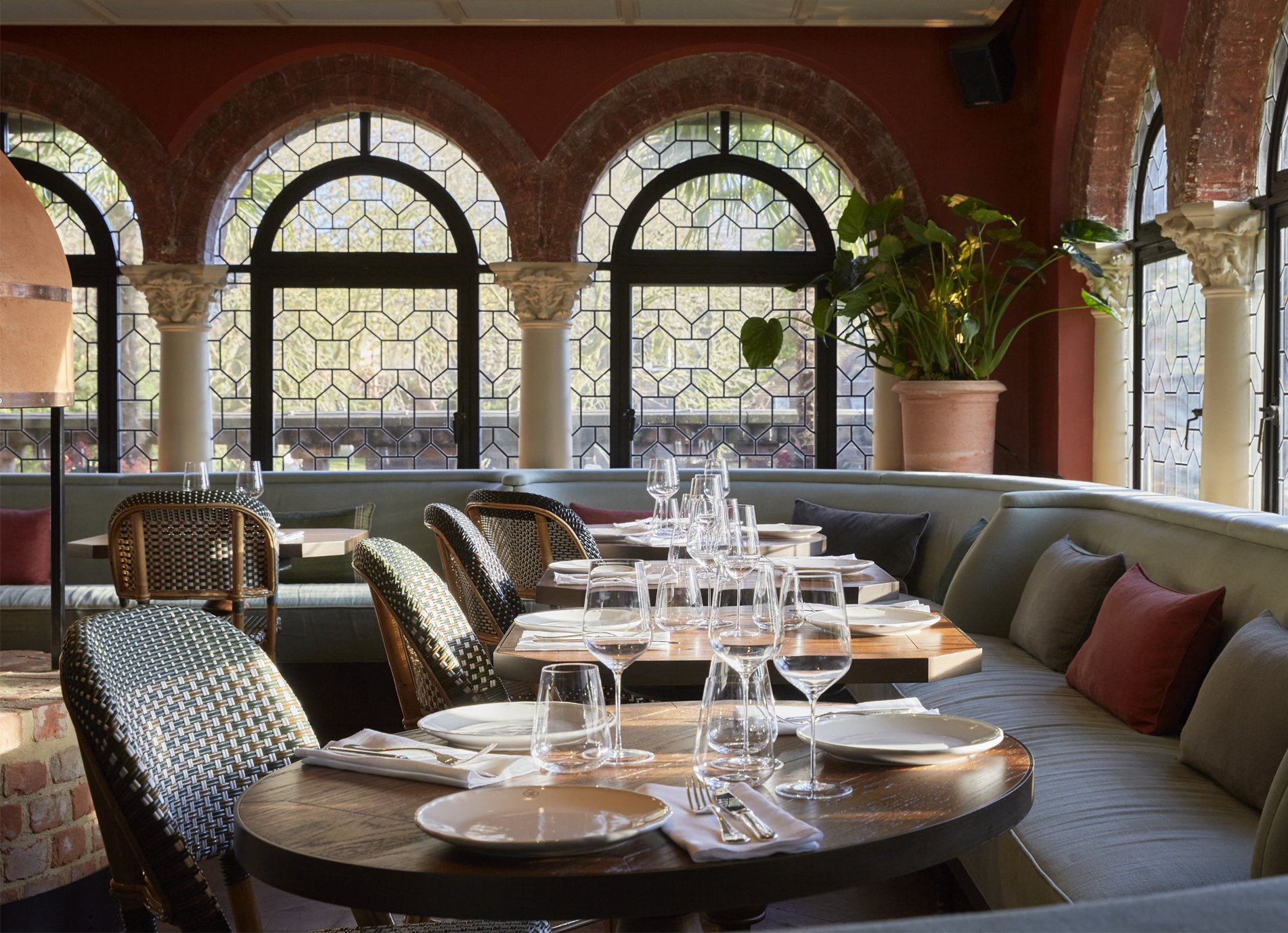 “The design creates an authentic interior which celebrates the original brickwork and the elegant proportions of the Georgian arcade while creating cosy settings for diners,” explains David Archer, co-founder of Archer Humphryes. “Fireplaces have been introduced on both levels, and there is a two-sided bar that wraps around the building’s colonnade, with views across the park, fountains and adjacent rose beds from each table. Set in the park with its veranda and opening colonnade, the restaurant becomes a summer house from the spring, while in the winter months it is cosy, romantic and atmospheric.”