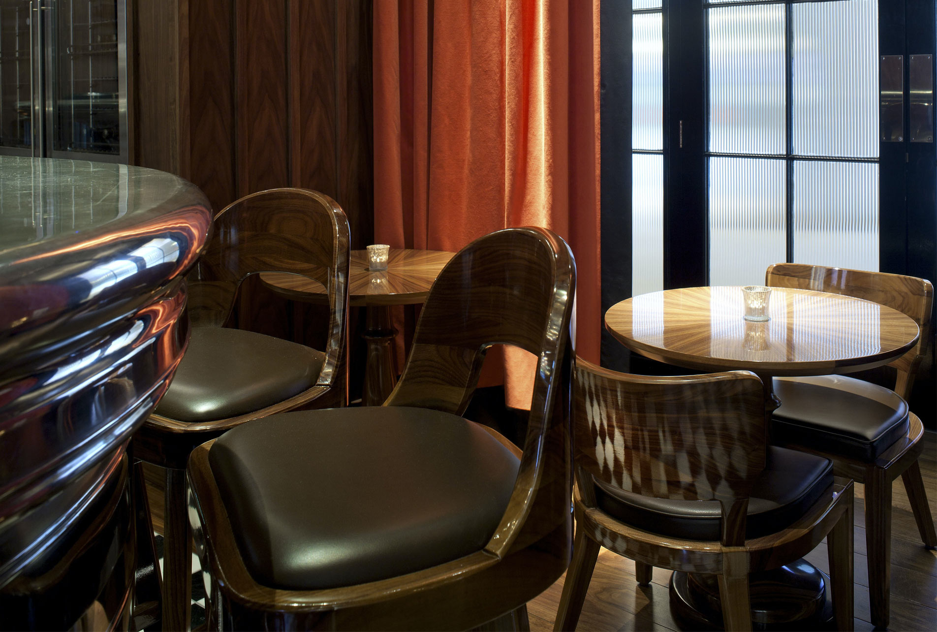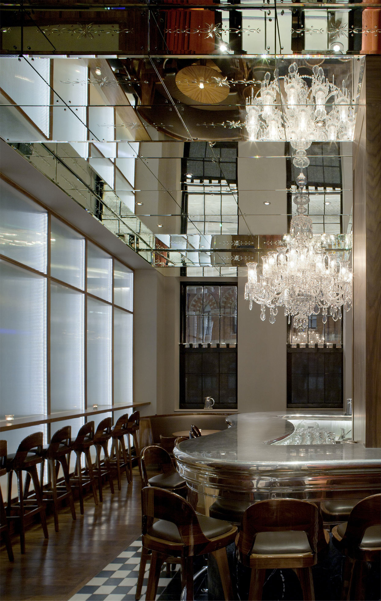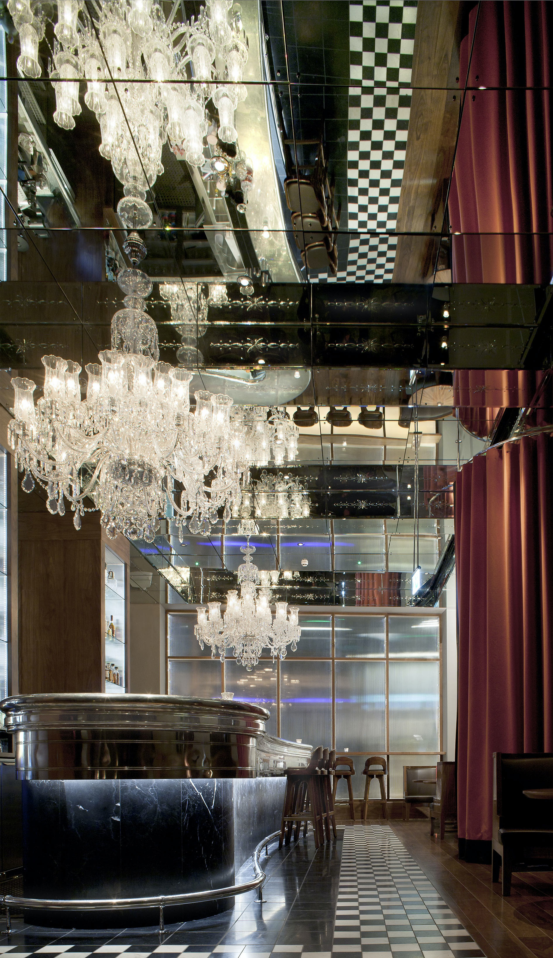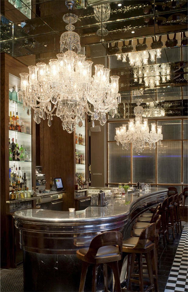 The bar’s already significant floor to ceiling heights are thrown into infinity with the introduction of a deep coffered engraved mirrored ceiling, which intern reflects the 25 meter long sinuous polished pewter bar. Depth and decoration is added with the suspension two grand decorative chandeliers, who’s image is shattered and eternally reflected around the coffers and ceiling surfaces. Viewed either from the fire lit balcony or deep upholstered leather banquette seating, guest’s are transported to an ambience of opportunity and stimulation paces from the boarding platforms to either Scotland, Paris or Beyond.